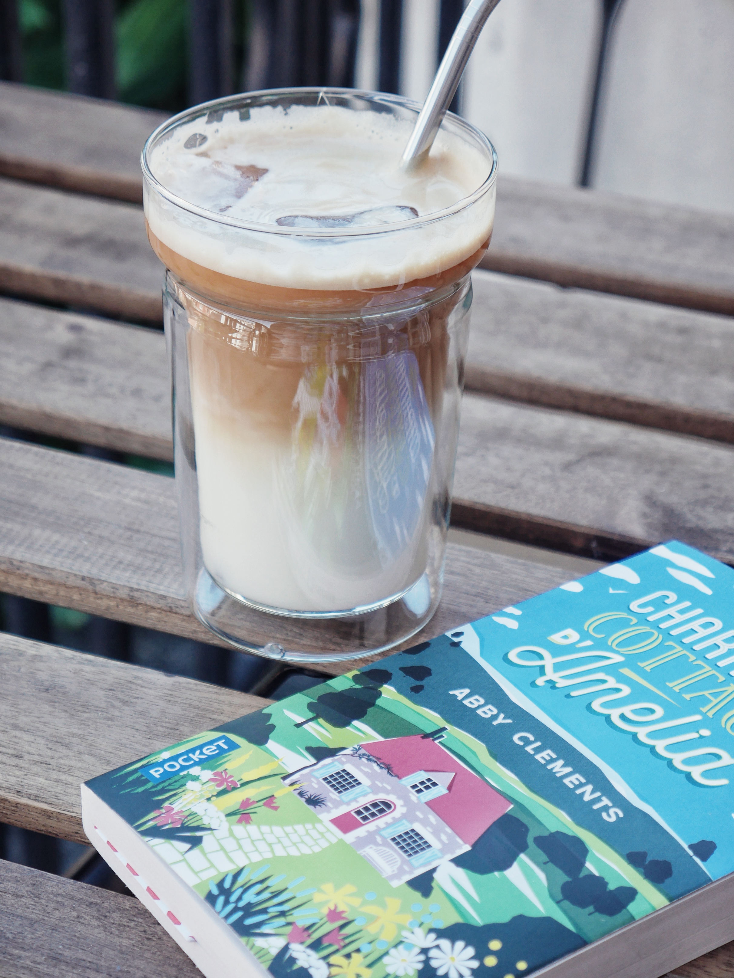 Iced latte maison et lecture de saison sur le balcon, ce moment que j’attends tout le reste de l’année!